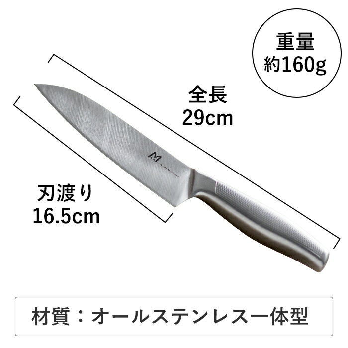 サイズ 全長/29cm 刃渡り/16.5cm 重量 約160g 材質 刃:ステンレス特殊鋼、ハンドル(柄):18−8ステンレス 原産国 日本 刃付け 両刃(右利き・左利き) 用途 肉・野菜・魚切り